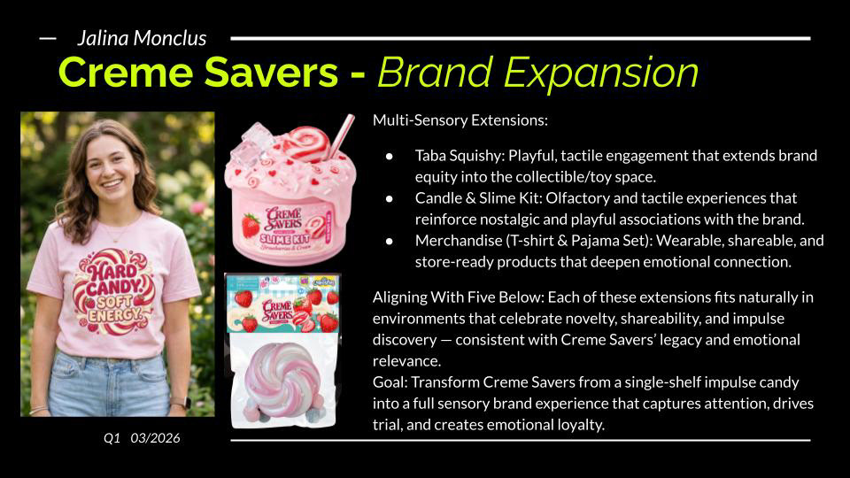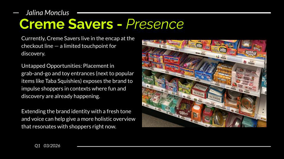 This speculative strategy deck explores how Creme Savers can evolve from a nostalgic candy product into a broader sensory brand experience. The concept was developed to identify new retail opportunities, deepen emotional relevance across generations, and create engagement pathways that extend beyond shelf presence.